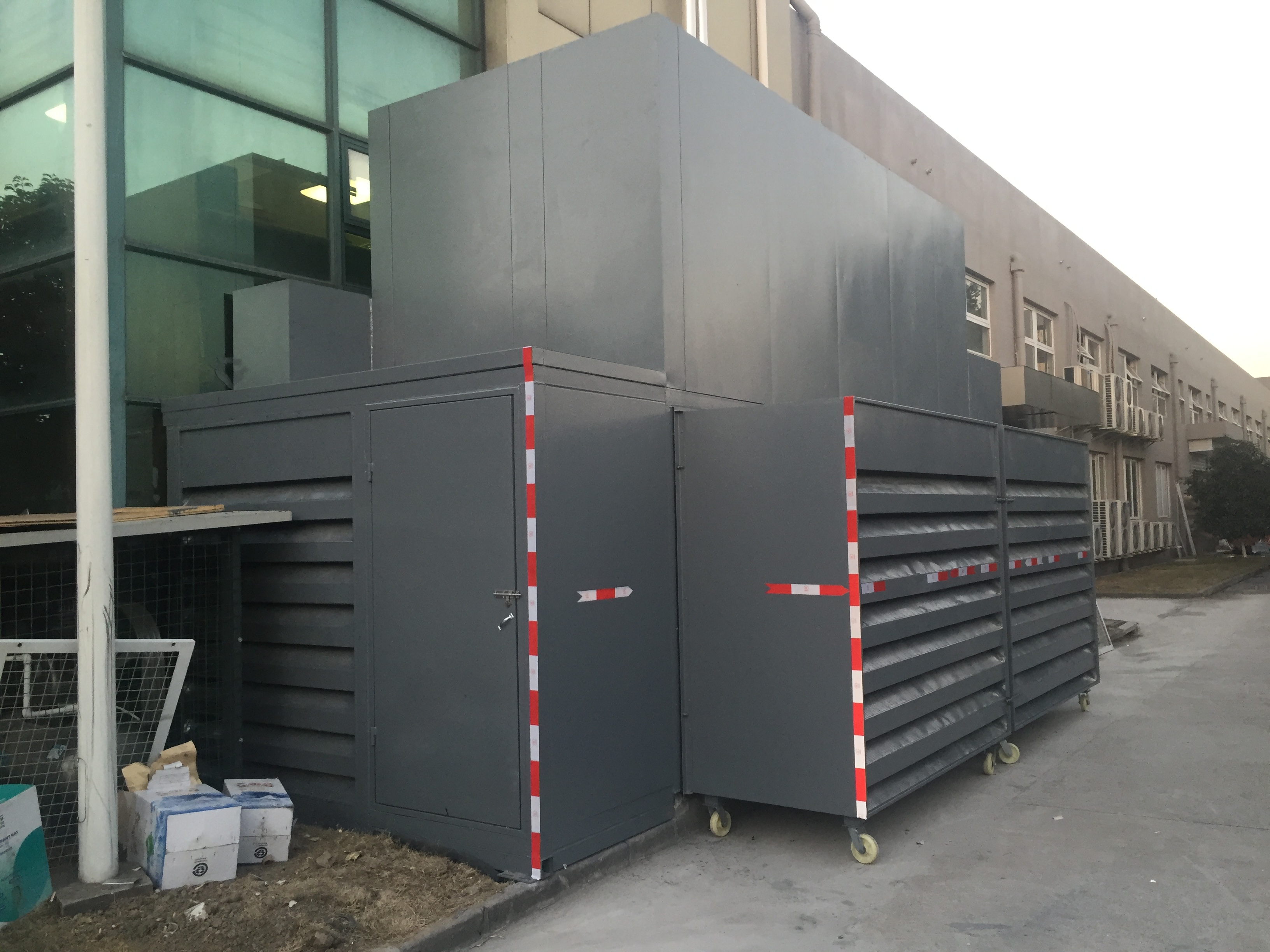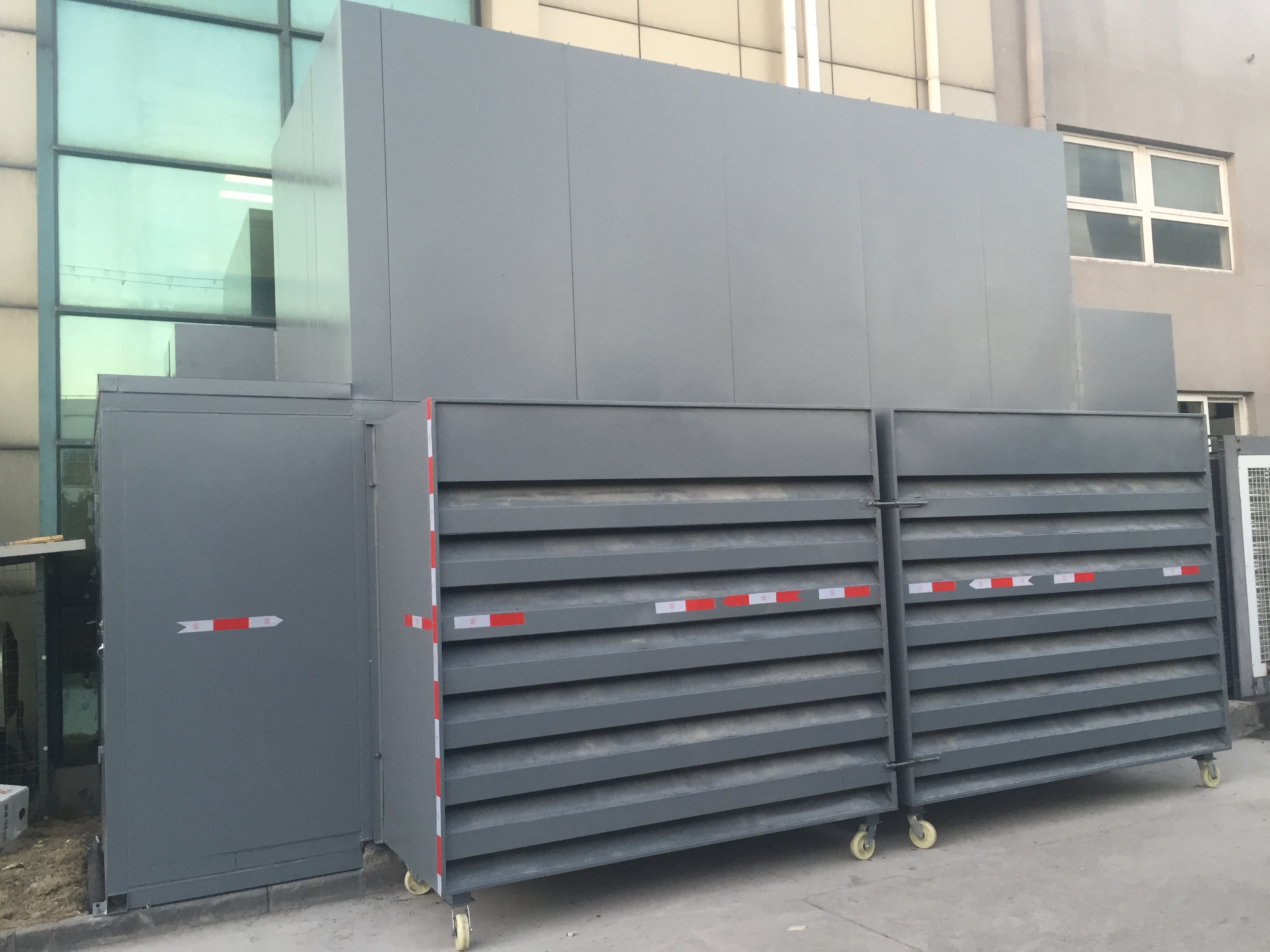 空調外機整體降噪設施由出風消聲(shēng)器、補風消聲器、進風(fēng)消聲百葉及附屬檢修門組成。
